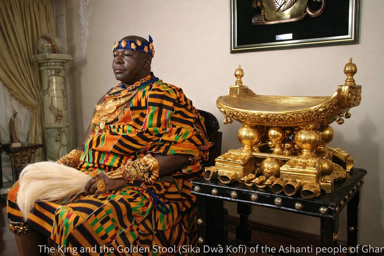 At the core of Asante identity is the Golden Stool — Sika Dwa Kofi — not a throne for sitting, but a sacred embodiment of authority and shared spirit. It is the soul of the nation made visible. Every Asante child grows up knowing that the Stool is not merely an object; it is the living bond between the ancestors, the present generation, and those yet to come.